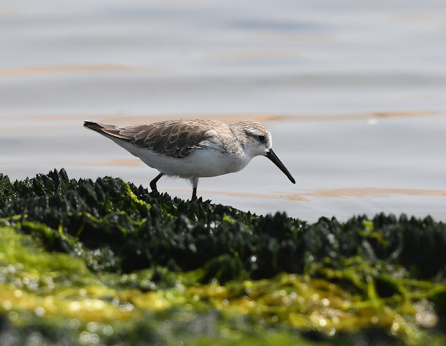 Several Western Sandpipers were joined by a single Semipalmated Sandpiper while feeding along the shore. With some effort, I managed a few photos of the two species side-by-side. Back home, Semipalmated Sandpipers are the default species while Westerns are a rare (but regular) migrant, one that we are always on the lookout for. The differences in structure, posture and bill shape are evident in this photo.